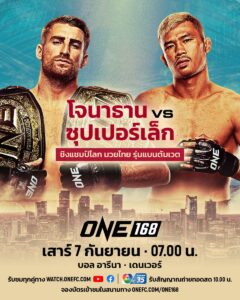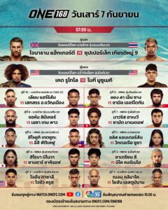 สำหรับศึก ONE 168 สามารถจองบัตรเข้าชมในสนามผ่านทาง Ticketmaster คู่แรกเริ่มเวลา 07.00 น. รับชมการถ่ายทอดสดทาง ช่อง 7HD กด 35 (ภาษาไทย) เริ่ม 10.00 น. เป็นต้นไป