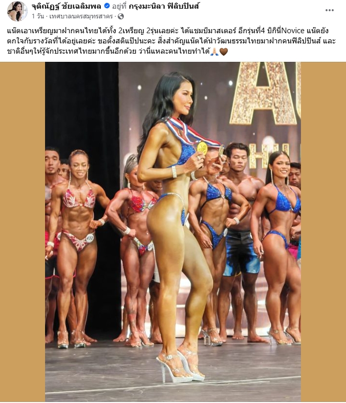 “แนทเอาเหรียญมาฝากคนไทยได้ทั้ง 2 เหรียญ 2 รุ่นเลยค่ะ ได้แชมป์มาสเตอร์ อีกรุ่นที่ 4 บิกินี่ Novice แนท ยังตกใจกับรางวัลที่ได้อยู่เลยค่ะ ขอตั้งสติแป๊ปนะคะ สิ่งสำคัญแนทได้นำวัฒนธรรมไทยมาฝากคนฟิลิปปินส์ และ ชาติอื่นๆให้รู้จักประเทศไทยมากขึ้นอีกด้วย ว่านี่แหละคนไทยทำได้”