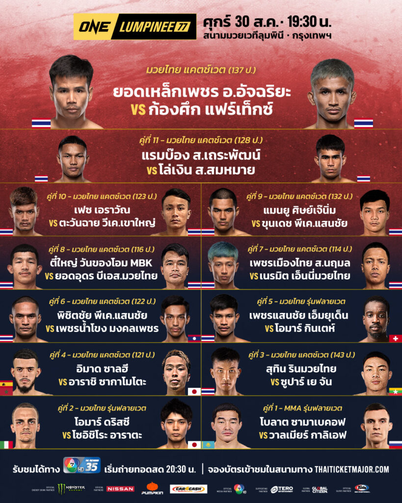 ติดตามชม “ยอดเหล็กเพชร vs ก้องศึก” ศึก ONE ลุมพินี 77 ถ่ายทอดสดจากสนามมวยเวทีลุมพินี (รามอินทรา) วันศุกร์ที่ 30 ส.ค.นี้ แฟนกีฬาการต่อสู้ชาวไทยสามารถจองบัตรเข้าชมในสนามผ่านทาง THAI TICKET MAJOR คู่แรกเริ่มเวลา 19.30 น. และรับชมทางช่องทางต่าง ๆ ดังนี้