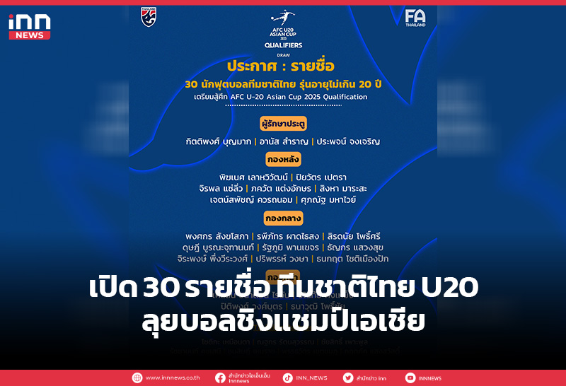 เปิด 30 รายชื่อ ทีมชาติไทย U20 ลุยบอลชิงแชมป์เอเชีย