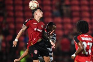 น.37 เมืองทองฯ ได้ลุ้นอีกครั้งจากจังหวะเตะมุมทางขวาของ ทริสตอง โด เข้ามากลางประตู ทรงวุฒิ ใคร่ครวญ เทคตัวขึ้นโหม่งบอลข้ามคานออกไปนิดเดียว