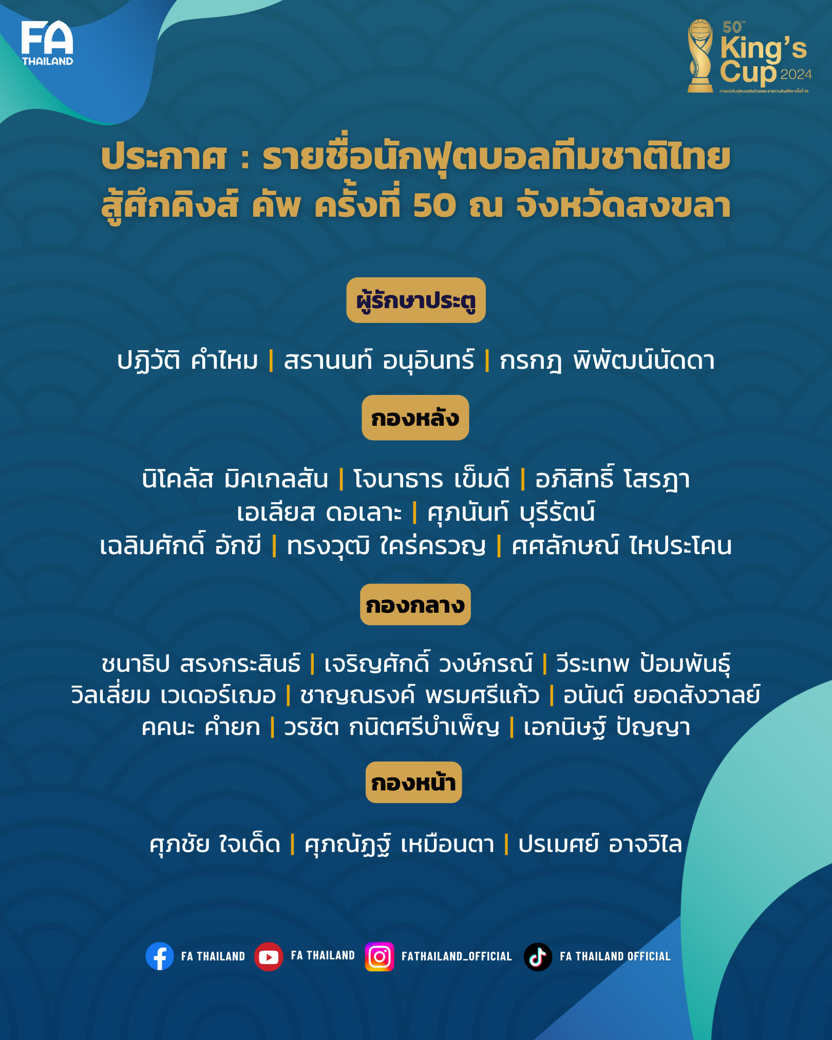 ทีมชาติไทย ประกาศ รายชื่อ 23 นักเตะ ชุดลุยศึก คิงส์ คัพ ครั้งที่ 50 ที่จังหวัดสงขลา มี “ชนาธิป” ขณะ ศุภชัย, ศุภณัฏฐ์ กองหน้า