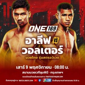 ยกระดับความเดือดเพิ่มอีก 1 คู่ ในศึก ONE 169 ที่จะจัดขึ้น ณ สนามมวยเวทีลุมพินี (รามอินทรา) ในช่วงไพรม์ไทม์อเมริกา ซึ่งตรงกับเวลา 08.00 น. วันเสาร์ที่ 9 พ.ย.นี้ โดยประกบ “อาลีฟ ส.เดชะพันธ์” ดาวรุ่งก้านยาวลูกครึ่งไทย-มาเลย์ วัย 20 ปี มาประชันเดือดกับ “วอลเตอร์ กอนซาลเวส” นักสู้มากฝีมือ วัย 26 ปี จากบราซิล ในกติกามวยไทย รุ่นสตรอว์เวต (115-125 ป.)