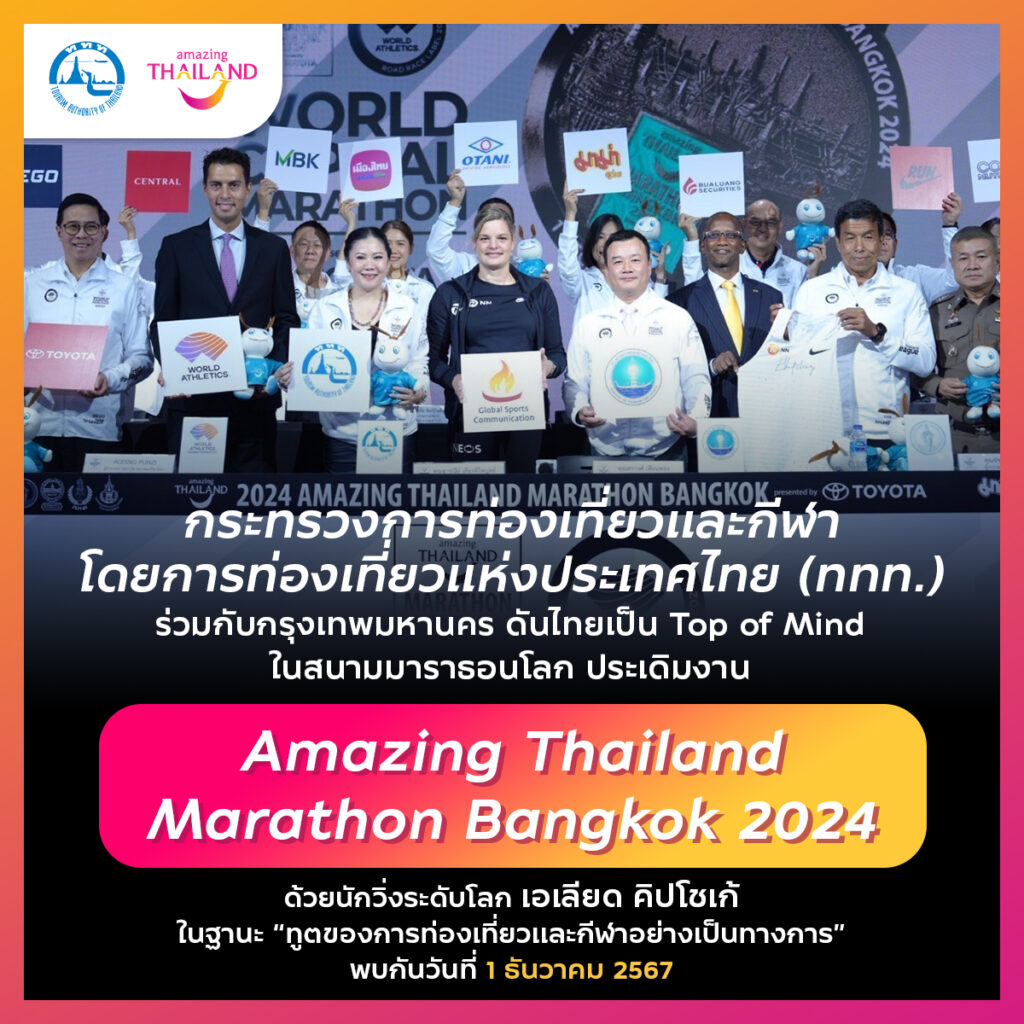 กระทรวงการท่องเที่ยวและกีฬา การท่องเที่ยวแห่งประเทศไทย (ททท.) กรุงเทพมหานคร สมาคมกรีฑาโลก การกีฬาแห่งประเทศไทย และไทยแลนด์ไตรลีก แถลงข่าวความพร้อมการจัดการแข่งขันวิ่งมาราธอนส่งเสริมการท่องเที่ยว “วิ่งผ่าเมือง ครั้งที่ 7” รายการ อะเมซิ่งไทยแลนด์มาราธอนแบงค็อก 2024 พรีเซ็นต์บายโตโยต้า ชิงถ้วยพระราชทานพระบาทสมเด็จพระเจ้าอยู่หัว สมเด็จพระนางเจ้าฯ พระบรมราชินี และสมเด็จพระเจ้าลูกเธอ เจ้าฟ้าพัชรกิติยาภาฯ ชิงเงินรางวัลรวม 2,440,500 บาท กำหนดจัดงานในวันอาทิตย์ที่ 1 ธ.ค.67 เวลา 02.00-09.30 น. มีนักวิ่งจาก 77 ประเทศทั่วโลก แห่สมัครร่วมแข่งขันมากเป็นประวัติการณ์ 3.3 หมื่นคน