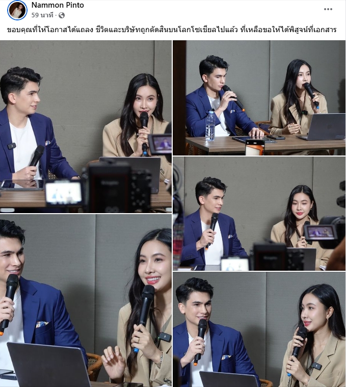ขณะที่ น้ำมนต์ ปินโต ได้โพสต์ข้อความผ่านเฟซบุ๊กส่วนตัวเช่นกันว่า “ขอบคุณที่ให้โอกาสได้แถลง ชีวิตและบริษัทถูกตัดสินบนโลกโซเชียลไปแล้ว ที่เหลือขอให้ได้พิสูจน์ที่เอกสาร”