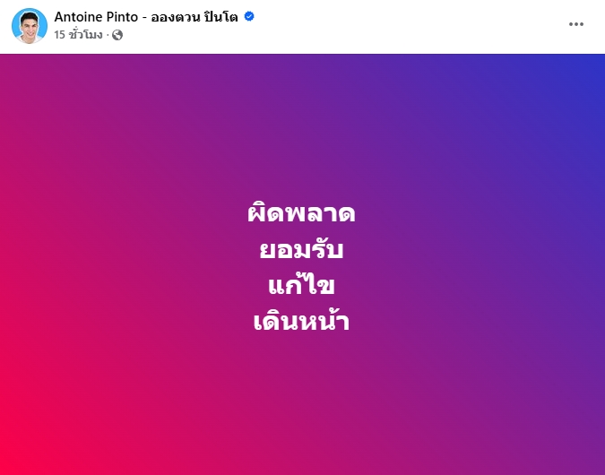 ล่าสุด อองตอน ได้ออกมาโพสต์ข้อความสั้นๆ อีกว่า “ผิดพลาดยอมรับ แก้ไข เดินหน้า”
