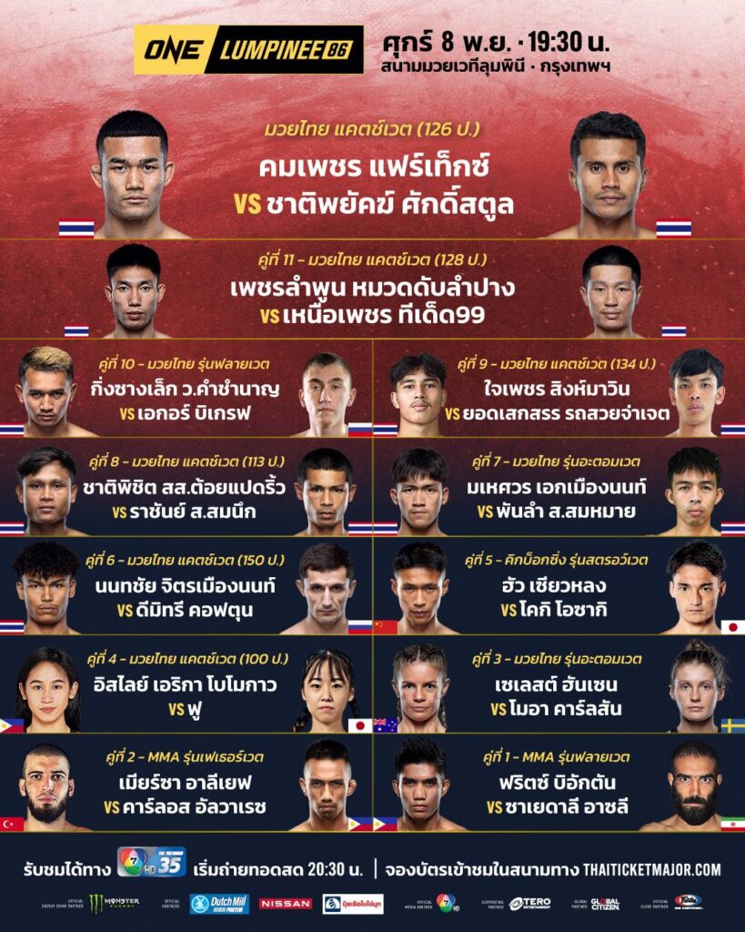 โปรแกรมการแข่งขันทุกคู่ศึก ONE ลุมพินี 86
