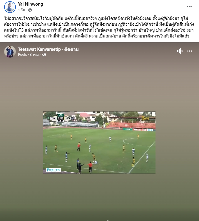 “ไม่อยากจะวิจารณ์อะไรกับผู้ตัดสิน แต่วันนี้มันสุดจริงๆ กูแม้งโครตผิดหวังในตัวมึงเลย ตั้งแต่รู้จักมึงมา กูไม่ต้องการให้มึงมาเข้าข้าง แค่มึงเป่าเป็นกลางก็พอ กูรู้จักมึงมาก่อน กูรู้ดีว่ามึงเป่าได้ดีกว่านี้ มึงเป็นผู้ตัดสินที่เก่งคนนึงในT3 แต่ภาพที่ออกมาวันนี้ กับสิ่งที่มึงทำวันนี้ มันชัดเจน กูไม่รู้หรอกว่า บ้านใหญ่ บ้านเล็กสั่งอะไรมึงมาหรือป่าว แต่ภาพที่ออกมาวันนี้มันชัดเจน ศักดิ์ศรี ความเป็นลูกผู้ชาย ศักดิ์ศรีชายชาติทหารในตัวมึงไม่มีแล้ว”