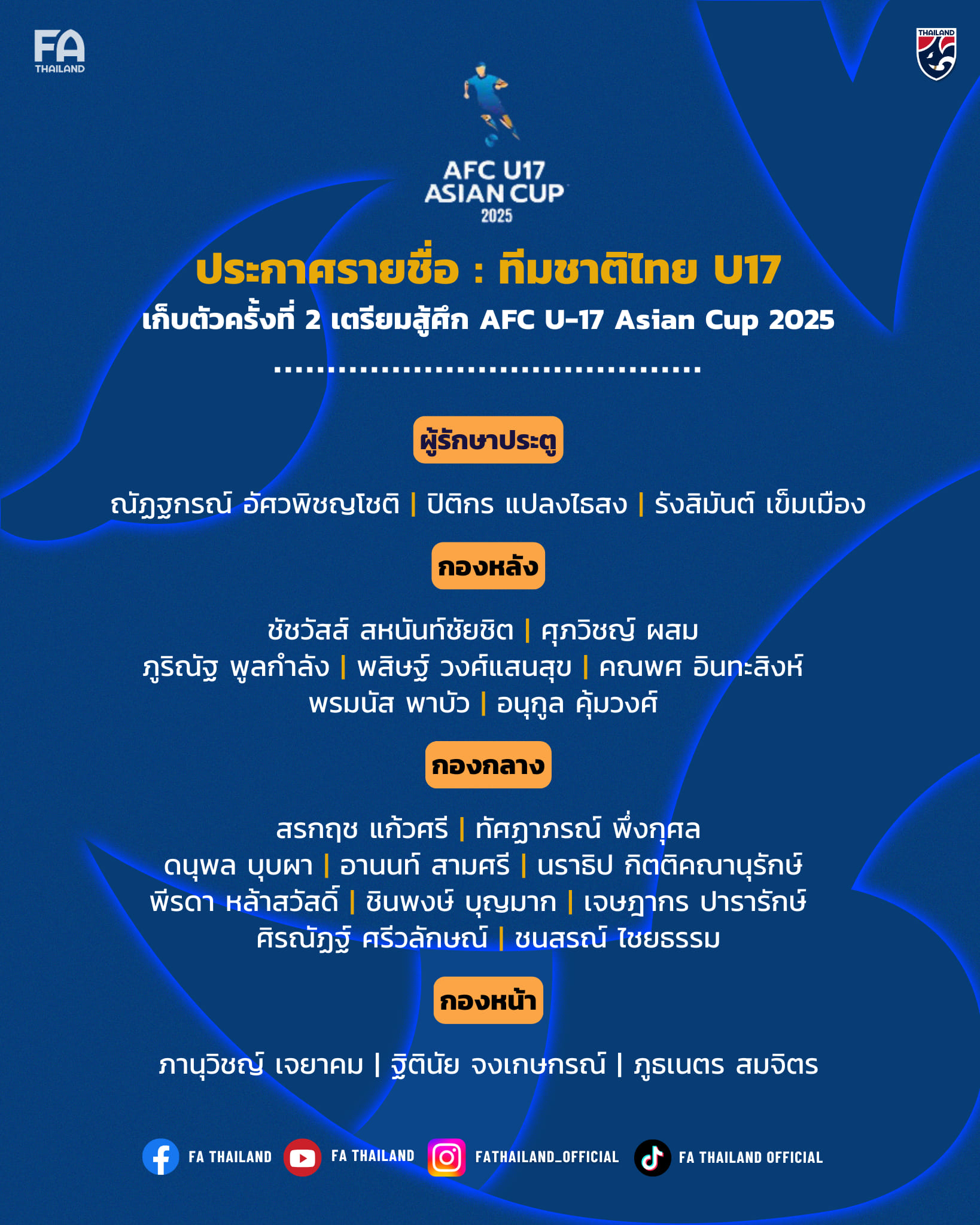 สมาคมกีฬาฟุตบอลแห่งประเทศไทย ในพระบรมราชูปถัมภ์ ประกาศรายชื่อ 23 นักฟุตบอลทีมชาติไทย รุ่นอายุไม่เกิน 17 ปี เก็บตัวรอบที่สอง เพื่อเตรียมพร้อมสำหรับการแข่งขัน ฟุตบอลชิงแชมป์เอเชีย รุ่นอายุไม่เกิน 17 ปี รอบสุดท้าย (2025 AFC U-17 Asian Cup) ที่ ซาอุดีอาระเบีย ระหว่างวันที่ 3-20 เมษายน 2568