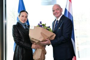 “มาดามแป้ง” นวลพรรณ ล่ำซำ นายกสมาคมกีฬาฟุตบอลแห่งประเทศไทยฯ ลุยงานด้านต่างประเทศต่อเนื่อง ล่าสุดเดินทางไปที่ สำนักงานใหญ่ ฟีฟ่า ที่ซูริค ประเทศสวิตเซอร์แลนด์ ครั้งแรก วันที่ 5 มีนาคม 2568 เพื่อเยี่ยมชม และ หารือเรื่องต่าง ๆ เพื่อนำกลับมาพัฒนาฟุตบอลไทย โดยมี จานนี อินฟานติโน ประธานสหพันธ์ฟุตบอลนานาชาติ (ฟีฟ่า) และ มาธิอัส กราฟสตรอม เลขาธิการฟีฟ่า ให้การต้อนรับอย่างอบอุ่น