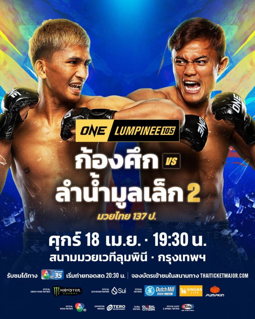 ONE ยังคงเดินหน้าเสิร์ฟความมันกันอย่างไม่หยุดยั้ง ล่าสุดมีการประกาศคู่มวยเตรียมปล่อยพลังในศึก ONE ลุมพินี 105 วันศุกร์ที่ 18 เม.ย.นี้ โดยคู่เอกนำรายการเป็นการรีแมตช์ภาคสองระหว่าง “ก้องศึก แฟร์เท็กซ์” มวยเชิงสวย วัย 24 ปี จากเมืองย่าโมโคราช และ “ลำน้ำมูลเล็ก ทีเด็ด99” จอมบู๊ฝีมือพระกาฬ วัย 26 ปี จากบุรีรัมย์ ในกติกามวยไทย 137 ป.