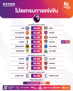 ศึกพรีเมียร์ลีกอังกฤษสัปดาห์ที่ 3 ฤดูกาล 2025/26 กำลังจะกลับมาสร้างความเร้าใจให้แฟนบอลทั่วโลกในสุดสัปดาห์นี้ โปรแกรมอัดแน่น ดุเดือดทุกสนาม! ตั้งแต่ วันเสาร์ที่ 30 สิงหาคม ถึง วันจันทร์ที่ 1 กันยายน 2568 ศึกสุดสัปดาห์นี้มีครบทั้งบิ๊กแมตช์ เกมดาร์บี้ และคู่เชือดเฉือนที่ห้ามกะพริบตา โดยสามารถรับชมความมันส์การแข่งขันถ่ายทอดสดครบทุกคู่ผ่านแพลตฟอร์มสตรีมมิ่ง Monomax ได้เต็มอรรถรสทุกแมตซ์!!!