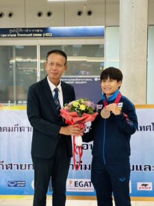โดยมีพลตรี อินทรัตน์ ยอดบางเตย นายกกิตติมศักดิ์สมาคมกีฬายกน้ำหนักสมัครเล่นแห่งประเทศไทย พร้อมด้วยคณะกรรมการบริหารสมาคมฯ ประกอบด้วย พลเอก วิสุทธิ์ เดชสกุล เลขาธิการฯ ,พลอากาศโท วัฒนชัย เจริญรัตน์ กรรมการ/ประธานฝ่ายเตรียมนักกีฬา, นายสมศักดิ์ กาญจนาคาร กรรมการ/ประธานฝ่ายสิทธิประโยชน์, นางสาวปัทมา ลำเต็ม ที่ปรึกษาฯ และนางธรพรรษธร วจีธัญเจริญกุล หัวหน้าฝ่ายประชาสัมพันธ์ให้การต้อนรับพร้อมมอบช่อดอกไม้เพื่อแสดงความยินดี