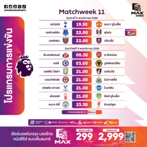 สัปดาห์ที่ 11 “Monomax” ยิงสดศึกพรีเมียร์ลีกฯ เดือดทุกสนาม ไฮไลต์บิ๊กแมตซ์ “ผีเยือนไก่-เรือใบฟัดหงส์”