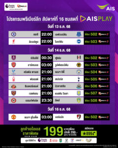 โปรแกรมถ่ายทอดสดฟุตบอลพรีเมียร์ลีก อังกฤษ นัดที่ 16 ของฤดูกาล ดังนี้