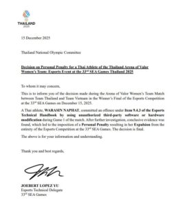 ล่าสุด คณะกรรมการจัดการแข่งขันซีเกมส์ ได้มีหนังสือแจ้งไปยัง คณะกรรมการโอลิมปิคแห่งประเทศไทยฯ ระบุบทลงโทษขั้นสูงสุดต่อ ณภัทร วราสินธ์ หรือ “Tokyogurl” นักกีฬาอีสปอร์ตทีมชาติไทย ด้วยการ ขับออกจากการแข่งขันซีเกมส์ ครั้งที่ 33 หลังตรวจพบว่ากระทำผิดตามข้อ 9.4.3 ของคู่มือเทคนิคการแข่งขันอีสปอร์ต ซึ่งว่าด้วยการใช้ซอฟต์แวร์ของบุคคลที่สามที่ไม่ได้รับอนุญาต หรือการดัดแปลงฮาร์ดแวร์ในระหว่างการแข่งขัน อันถือเป็นการละเมิดหลักการแข่งขันอย่างร้ายแรง