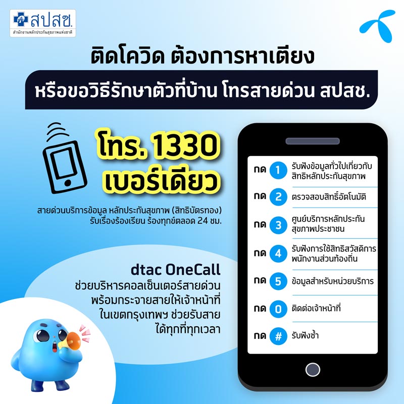 ติดโควิด ต้องการหาเตียง หรือขอวิธีรักษาตัวที่บ้าน โทรสายด่วน 1330 สปสช. เบอร์เดียว dtac OneCall ช่วยบริหารคอลเซ็นเตอร์สายด่วน ที่พร้อมกระจายสายให้เจ้าหน้าที่ในเขตกรุงเทพฯ ช่วยรับสายได้ทุกที่ทุกเวลา