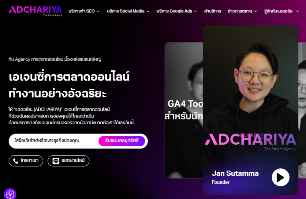แอดฉริยะ ADCHARIYA เราคือตัวจริงด้านโฆษณาออนไลน์ของคุณอย่างครบวงจร ด้วยประสบการณ์ในการดูแลลูกค้าหลากหลายอุตสาหกรรม เราเข้าใจความท้าทายและความต้องการที่แตกต่างกันของแต่ละธุรกิจ พร้อมนำเสนอกลยุทธ์ที่เหมาะสมเพื่อให้คุณได้ผลลัพธ์ที่คุ้มค่ากับการลงทุน