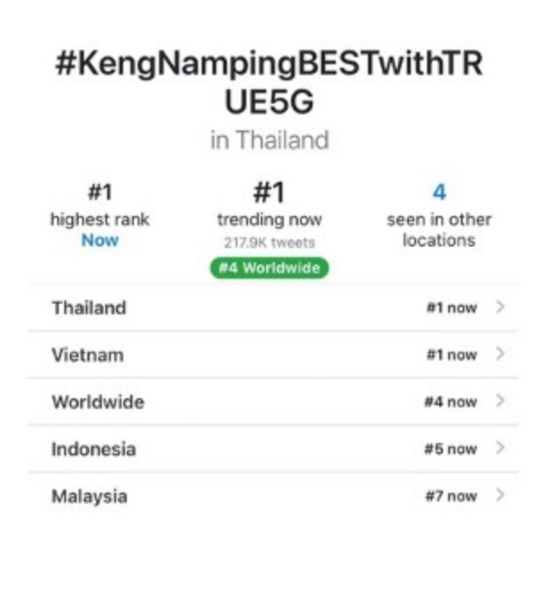 สร้างปรากฏการณ์สยามแตก! แฟนคลับแห่รับ ‘เก่ง-น้ำปิง’ เข้าครอบครัวทรู การันตีสัญญาณแรง ส่งมอบความสุขทะลุพิกัดสยาม สะเทือนโซเชียล ดันแฮชแท็ก #KengNampingBESTwithTRUE5G จนพุ่งชนเพดาน อันดับ 1 เทรนด์ x ไทยและเวียดนาม แบบม้วนเดียวจบ แถมยังแรงไกลไปถึง อันดับ 4 ของโลก พร้อมยึดพื้นที่เทรนด์ในอินโดนีเซียและมาเลเซีย “ด้วยยอด repost ใน X ถล่มทลายกว่า 2.06 ล้านข้อความและ Engagement มากกว่า 4 ล้าน (ข้อมูล ณ วันที่ 7 ธ.ค. 2568) การันตีความปังของคู่จิ้นขวัญใจมหาชน และสัญญาณทรูที่เชื่อมความรักของแฟนๆ ถึงศิลปินได้เร็ว แรง และชัดเจนที่สุดในวินาทีนี้!