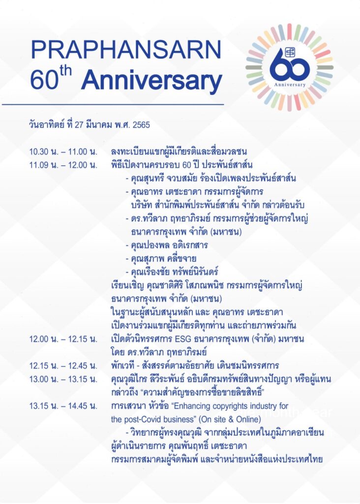สำนักพิมพ์ประพันธ์สาส์น เตรียมจัดกิจกรรมมากมายที่ได้สร้างสรรค์ เพื่อขับเคลื่อนเสริมสร้างให้เยาวชนและบุคคลทั่วไปเห็นถึงคุณค่าของการอ่าน โดย วันอาทิตย์ที่ 27 มีนาคม 2565 กำหนดจัดพิธีเปิดงานครบรอบ 60 ปีประพันธ์สาส์น, เปิดตัวนิทรรศการ ESG ธนาคารกรุงเทพ จำกัด (มหาชน) , การเสวนา “Enhancing copyrights industry for the post-Covid business” , “จากบรรณาธิการแอนะล็อก สู่วรรณกรรมออนไลน์“ ฯลฯ
