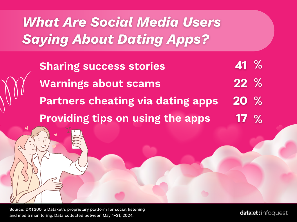 From an analysis of social media opinions on dating apps, it was found that 41% of users shared their personal success stories of finding partners through these apps. Another 22% issued warnings about scams involving fraudsters posing as potential dates. Additionally, 20% shared stories of partners cheating via dating apps, while the remaining 17% provided tips on how to use the apps effectively.