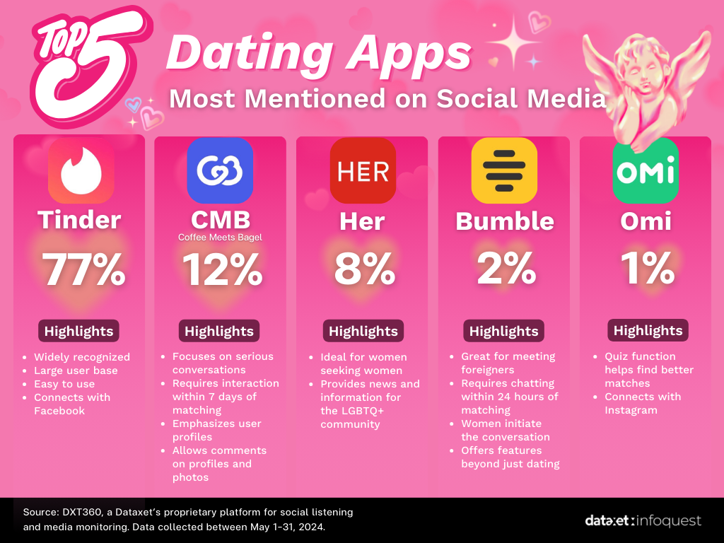 When it comes to dating applications that are popular among singles worldwide, there are many options, each with its unique features and perks. In Thailand, the most mentioned dating app on social media in May 2024 was Tinder (77%), followed by Coffee Meets Bagel (12%), Her (8%), Bumble (2%), and Omi (1%).
