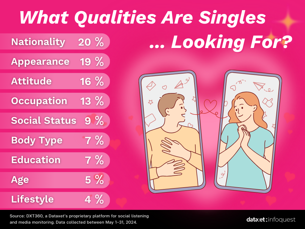According to Insight data, nationality is the primary factor singles consider when deciding to get to know someone, with 20% of singles prioritizing it. For example, the news about "Khun Woon Sen," a German national often dubbed "Thailand's John Wick," who found love with his Thai wife through a dating app, illustrates this preference. Other factors that influence their decisions include appearance, attitude, occupation, social status, body type, education, age, and lifestyle.