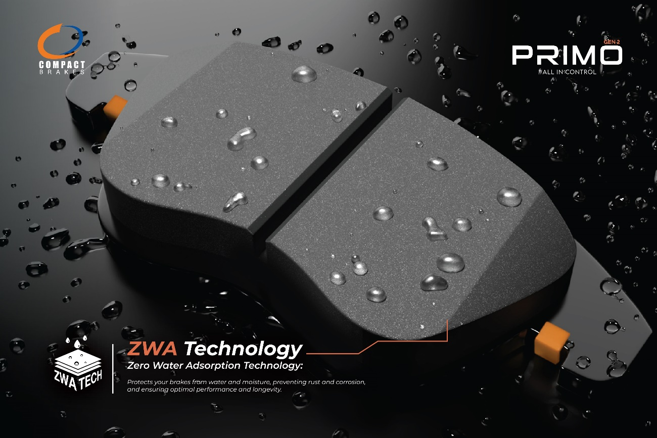ผ้าเบรกรุ่นใหม่นี้โดดเด่นและเหนือกว่าด้วยคุณสมบัติกันน้ำ กันความชื้น ลดการกัดกร่อน ลดสนิม ช่วยยืดอายุการใช้งานได้ยาวนานกว่าเดิม เนื่องจากมีเทคโนโลยีใหม่ ZWA (Zero Water Adsorption Technology) ลิขสิทธิ์เฉพาะของ คอมแพ็ค เบรก