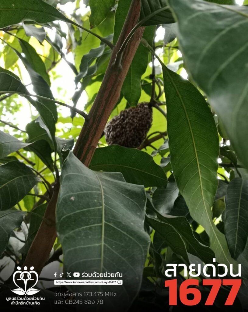 ผวา! ผึ้งทำรังอยู่บนต้นไม้หน้าบ้าน แจ้งอาสาร่วมด้วยช่วยกำจัด