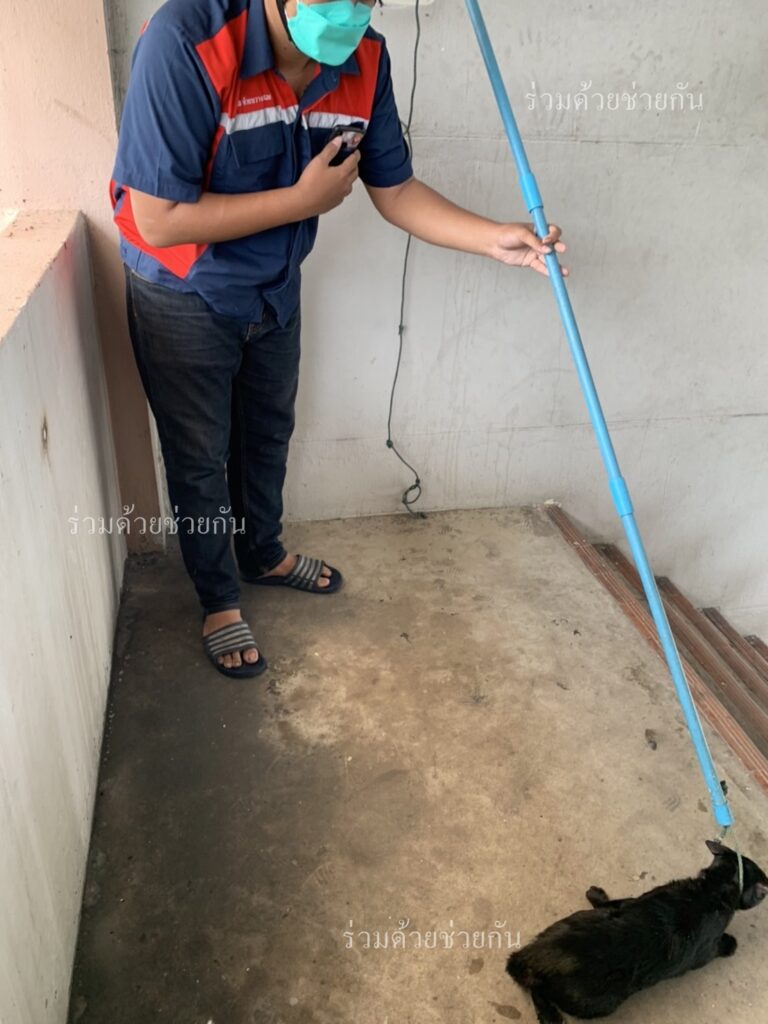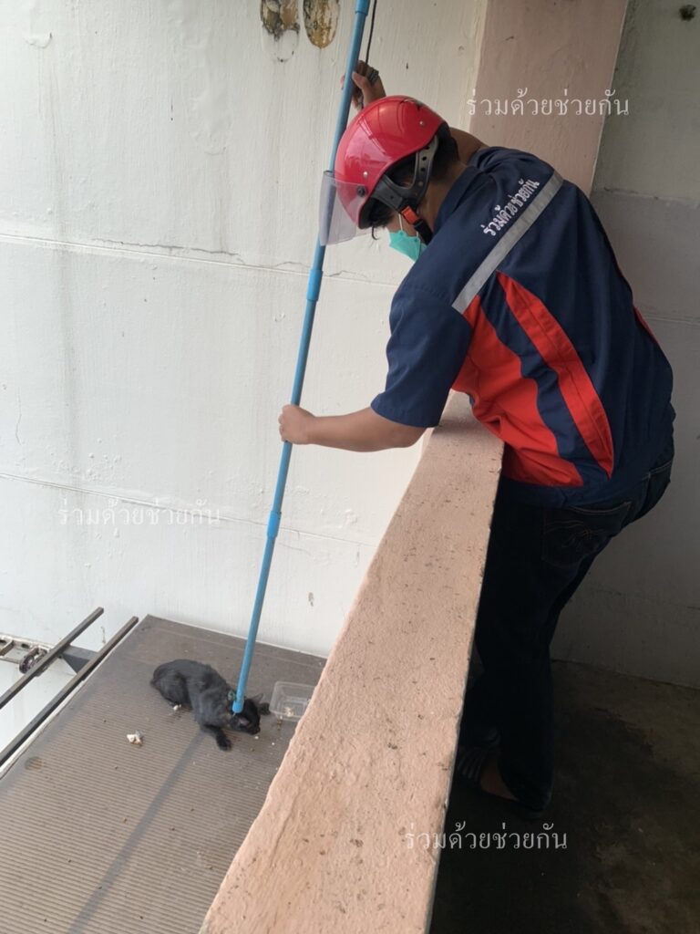 ประชาชนขอความช่วยเหลือ แมวขึ้นไปติดอยู่บนเหล็กร้อยสายไฟที่ติดอยู่ผนังอาคาร ถ.ประชาสงเคราะห์ อาสาร่วมด้วยรีบเข้าให้การช่วยเหลือ