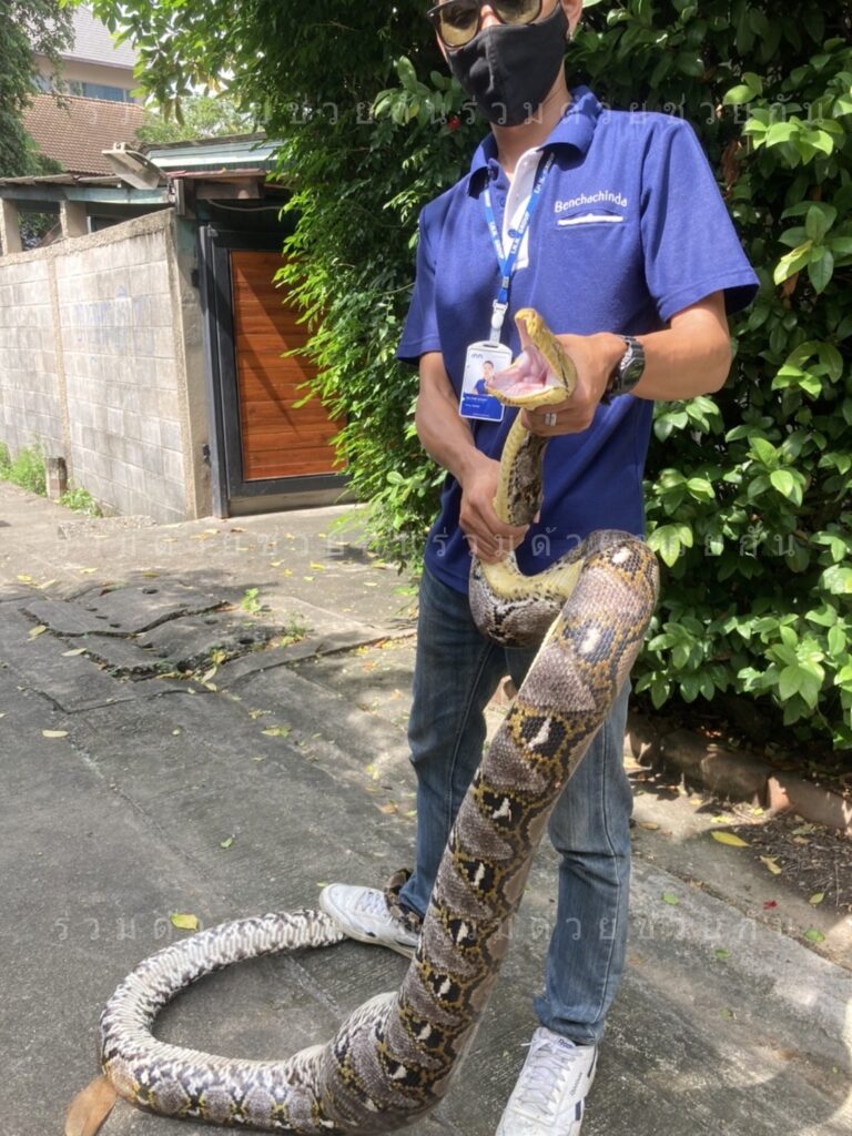 อาสาร่วมด้วยฯ ช่วยเหลือประชาชนจับงูเหลือมยาว 3 เมตร เข้าไปกินไก่ในเล้า ซอยเอกมัย 23 ถนนสุขุมวิท 63 เขตวัฒนา กรุงเทพฯ