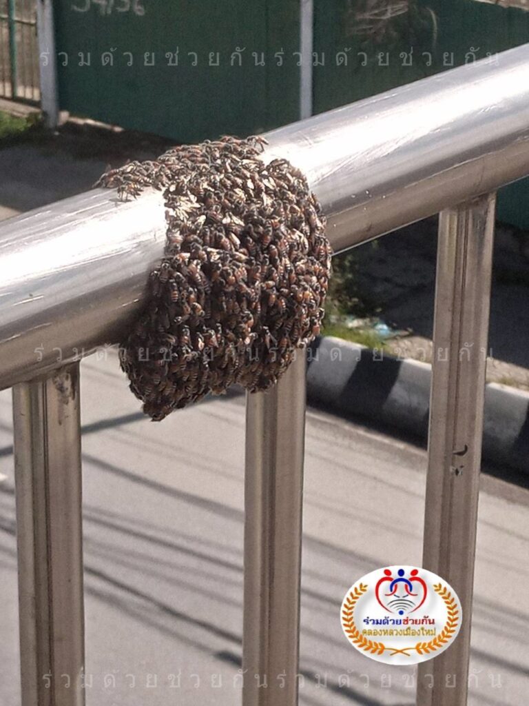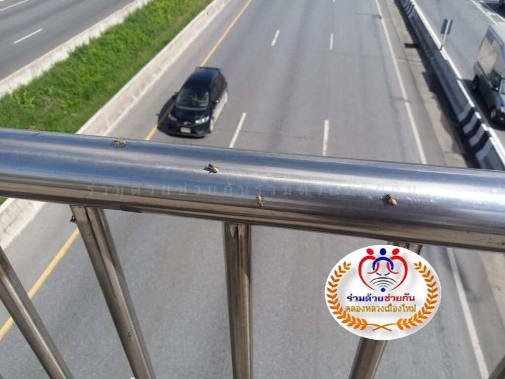 อาสาร่วมด้วยคลองหลวงเมืองใหม่ 107 ช่วยกำจัดรังผึ้งบนสะพานลอยคนข้าม เพื่อป้องกันผึ้งทำอันตรายชาวบ้านที่สัญจรผ่านไปมา จุดเกิดเหตุหน้าศูนย์รถยนต์มิตซูบิชิ นวนคร ถนนพหลโยธิน อำเภอคลองหลวง จังหวัดปทุมธานี ลักษณะเป็นกลุ่มผึ้งจำนวนมาก กำลังรวมตัวกันเพื่อสร้างรังบนราวสะพาน อาสาร่วมด้วยฯ ดำเนินการจำกัดรังผึ้งเรียบร้อยแล้ว
