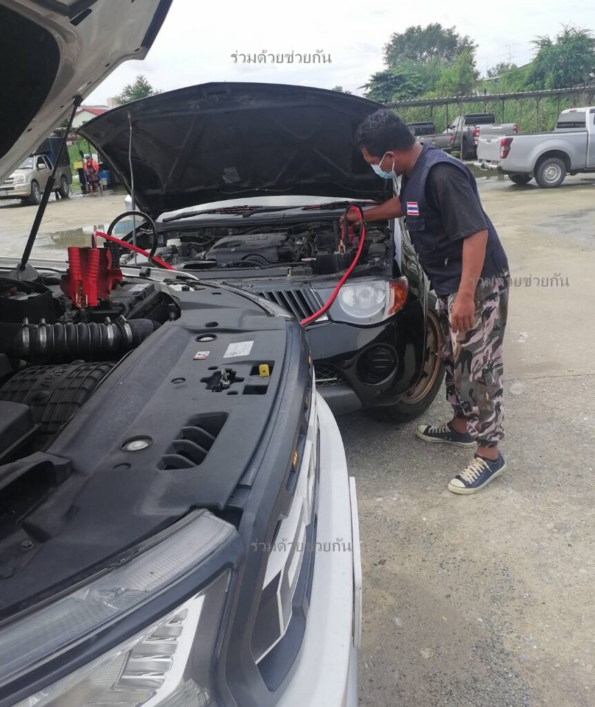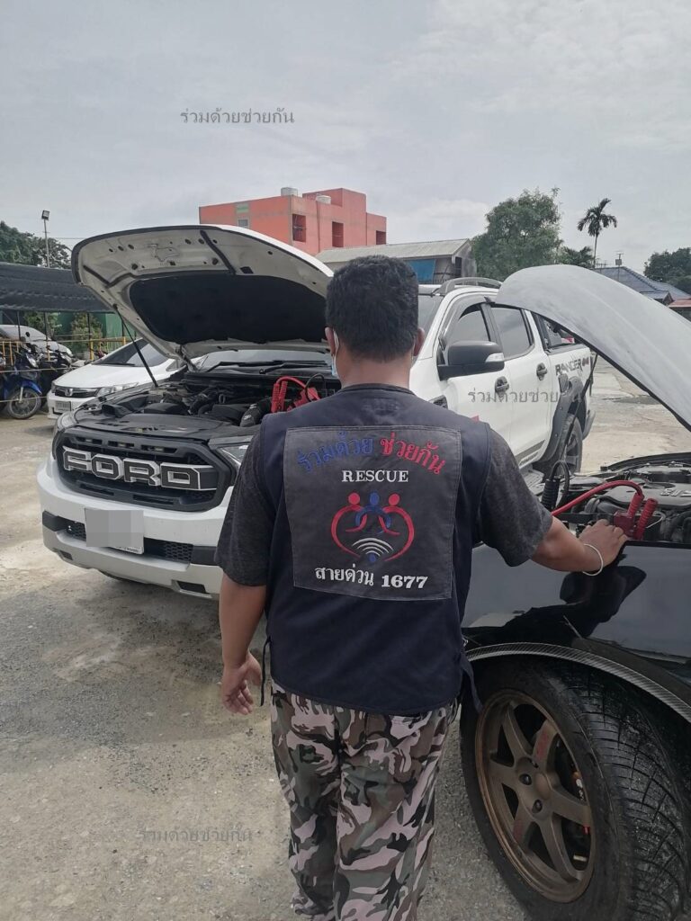 อาสาเข้าตรวจสอบพบรถกระบะ ฟอร์ด สีขาว อาสาใช้อุปกรณ์เข้าช่วยเหลือพ่วงแบตเตอรี่ได้สำเร็จ รถสามารถติดขับเคลื่อนต่อไปได้