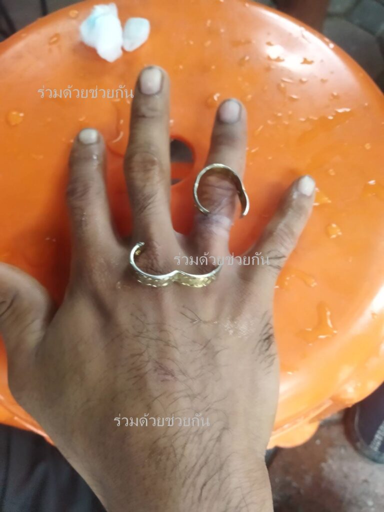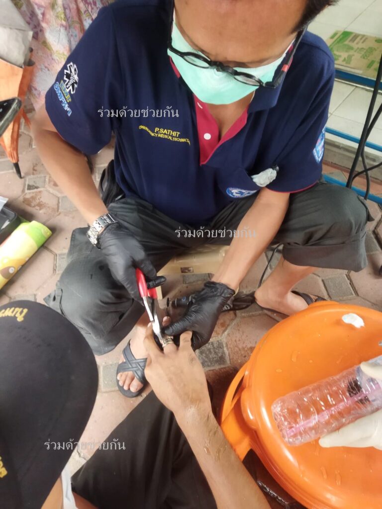 อาสาเข้าตรวจสอบ พบแหวนติดนิ้วนางด้านขวา จำนวน 2 วง มีอาการบวม อาสาใช้อุปกรณ์ คีมและเครื่องเจียขนาดเล็กตัดแหวนได้สำเร็จ สามารถถอดแหวนออกจากนิ้วได้อย่างปลอดภัย