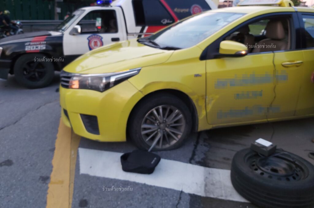 รถกระบะและรถแท็กซี่ชนกัน ล้อยางแตกทั้งคู่ ไปต่อไม่ได้ อยู่ถนนรามคำแหง ซอย 24 อาสาร่วมด้วยรีบเข้าให้การช่วยเหลือ
