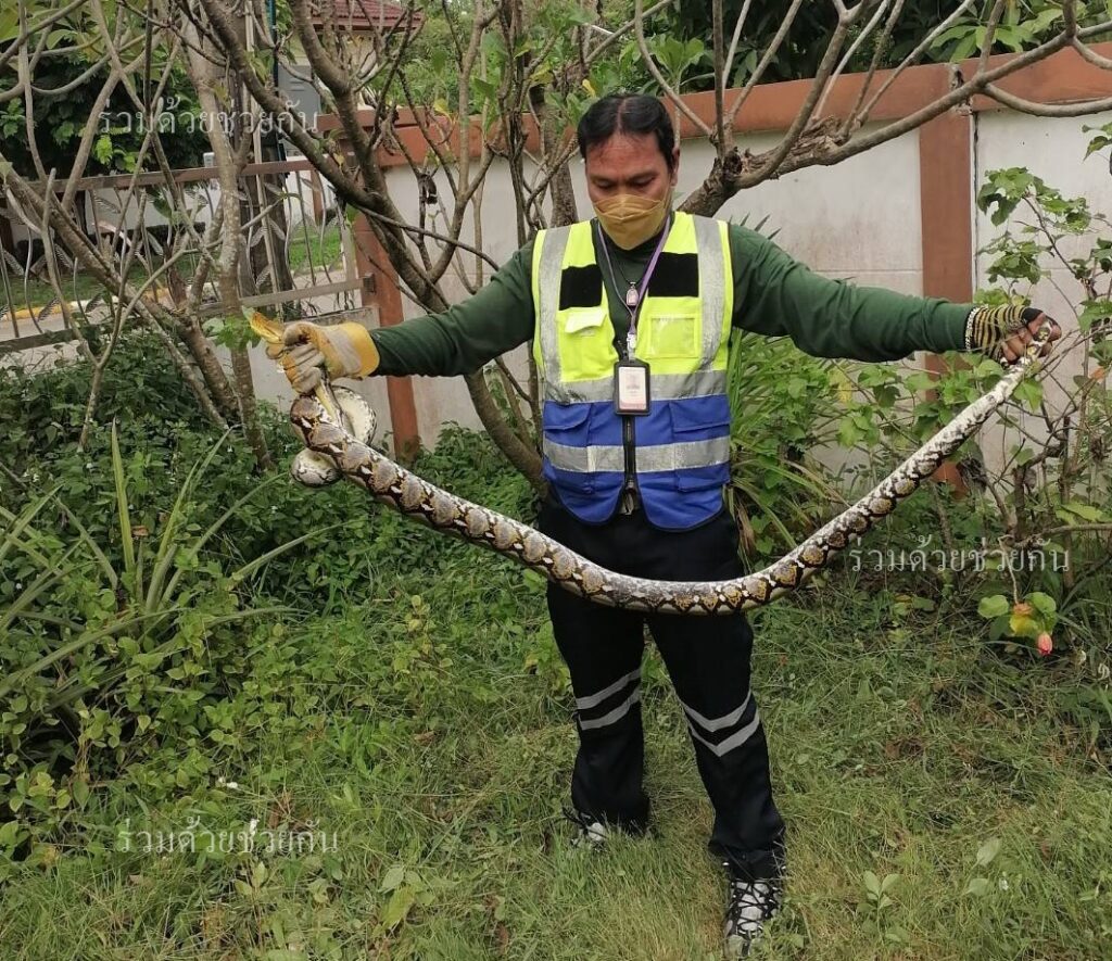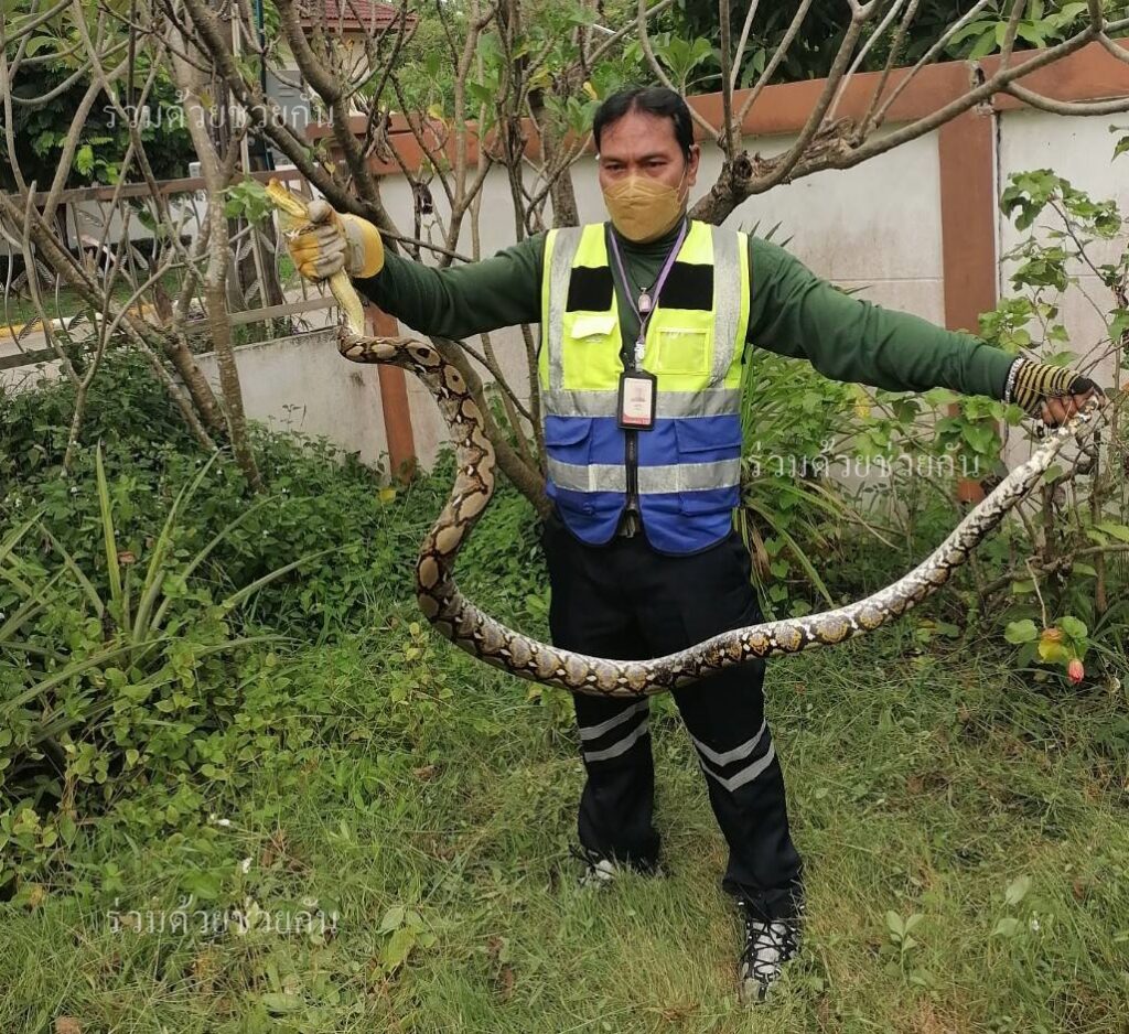 อาสาร่วมด้วยได้นำอุปกรณ์เข้าช่วยเหลือ ทำการจับตัวงูเอาไว้ได้เป็นผลสำเร็จ ความยาวประมาณ 3 เมตร และนำไปปล่อยคืนสู่พื้นที่ธรรมชาติห่างไกลบ้านเรือนประชาชนต่อไป