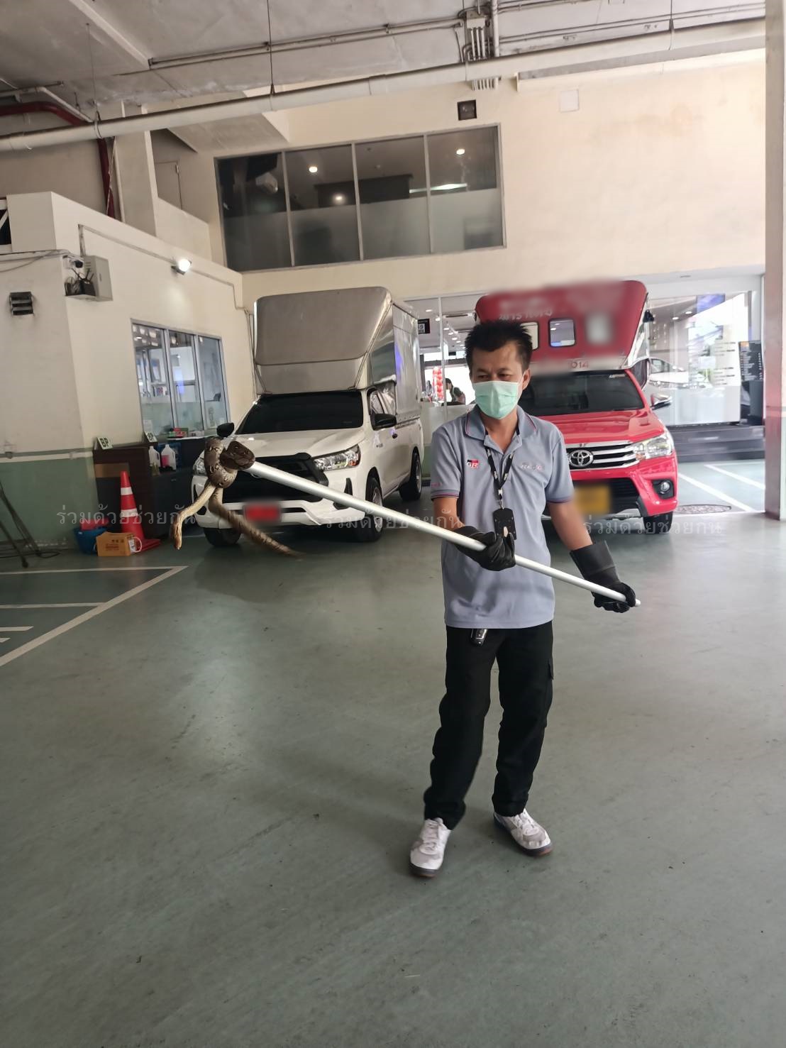 อาสาร่วมด้วยมิตรภาพ 114 ช่วยเหลือจับงู ภายในศูนย์โตโยต้า ถนนศรีนครินทร์ ซอย 50 มีประชาชนขอความช่วยเหลือ นำรถเข้าศูนย์ฯ ปรากฏว่ามีงูซุกอยู่ในรถยนต์โตโยต้า ฟอร์จูนเนอร์ สีขาว พนักงานและเจ้าของรถต่างคนต่างกลัว จึงแจ้งอาสาฯ ช่วยเหลือ ตรวจสอบพบเป็นงูเหลือมซุกอยู่ในคอนโซลรถ จึงนำอุปกรณ์ไม้บ่วงเชือกคล้องจับไว้ได้ ก่อนนำไปปล่อยคืนสู่ธรรมชาติต่อไป