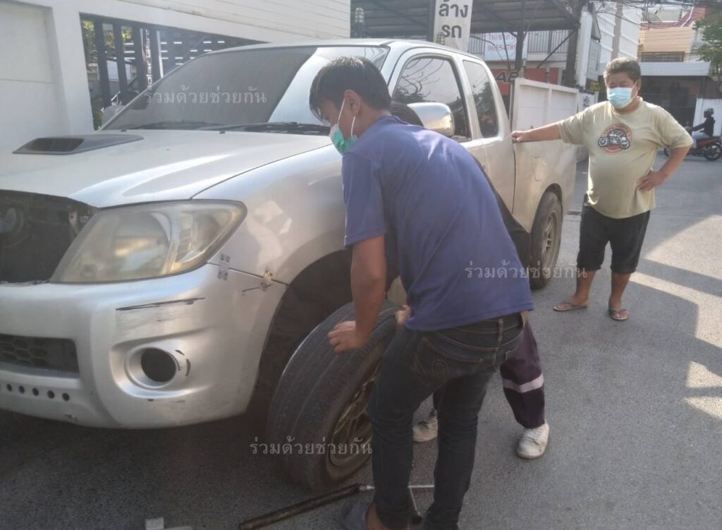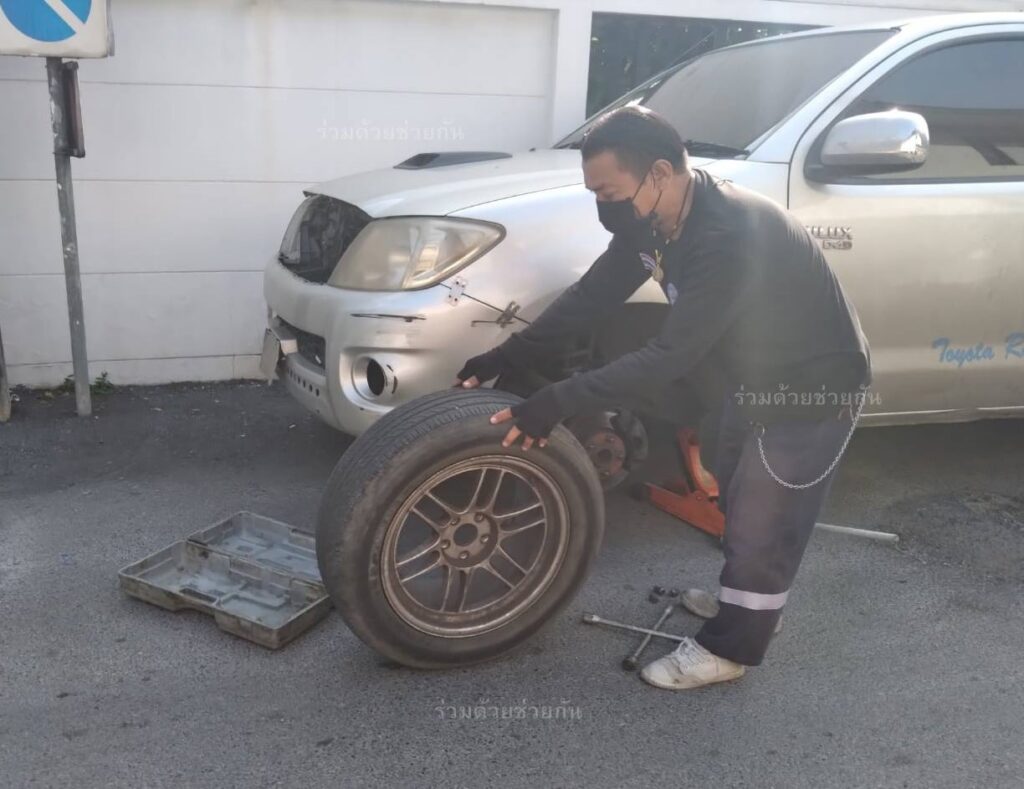 อาสาร่วมด้วยได้นำอุปกรณ์เข้าช่วยเหลือ ทำการปรับเปลี่ยนล้อยางอะไหล่ให้เป็นผลสำเร็จ รถขับเคลื่อนต่อไปได้ พื้นที่สน.คลองตัน