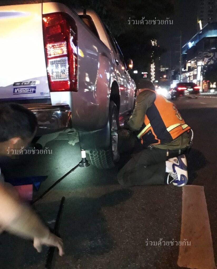 อาสาร่วมด้วยได้นำอุปกรณ์เข้าช่วยเหลือ ทำการปรับเปลี่ยนล้อยางอะไหล่ให้เป็นผลสำเร็จ รถขับเคลื่อนต่อไปได้ตามปกติ พื้นที่สน.ทองหล่อ