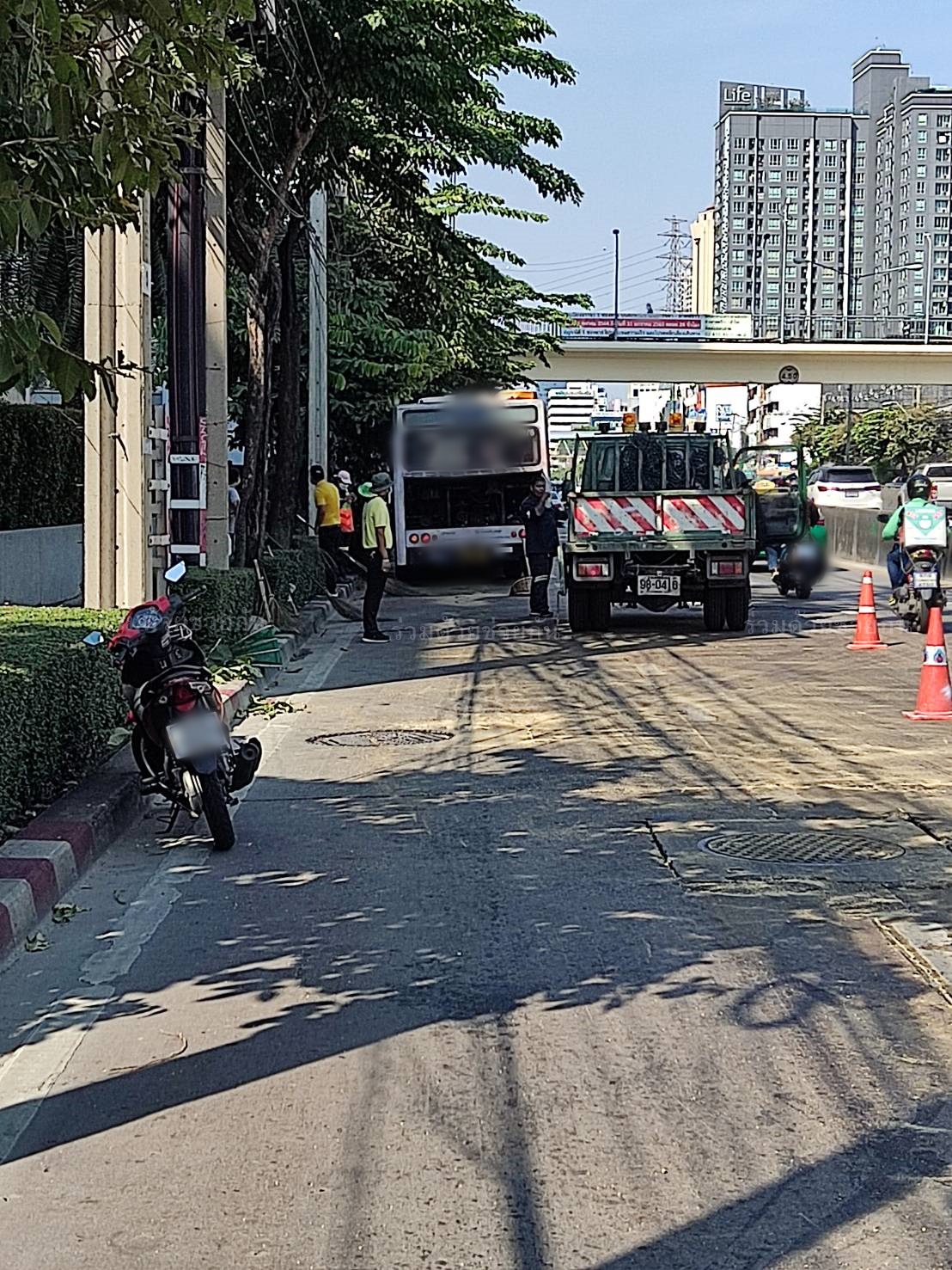 รถโดยสารประจำทางน้ำมันรั่ว คราบไหลนองเกลื่อนถนนรัชดาภิเษก