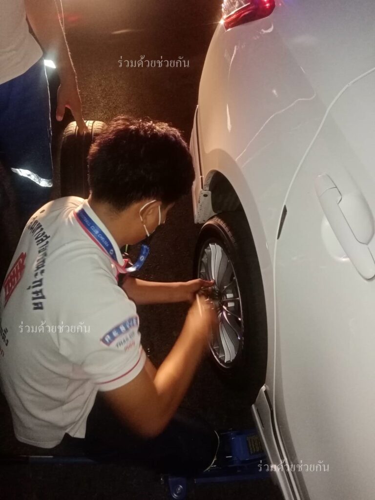 ประชาชนขอความช่วยเหลือรถจอดเสีย ล้อยางรั่ว จอดอยู่ถนนพระราม 9 อาสาร่วมด้วยเข้าให้การช่วยเหลือจนขับเคลื่อนต่อไปได้