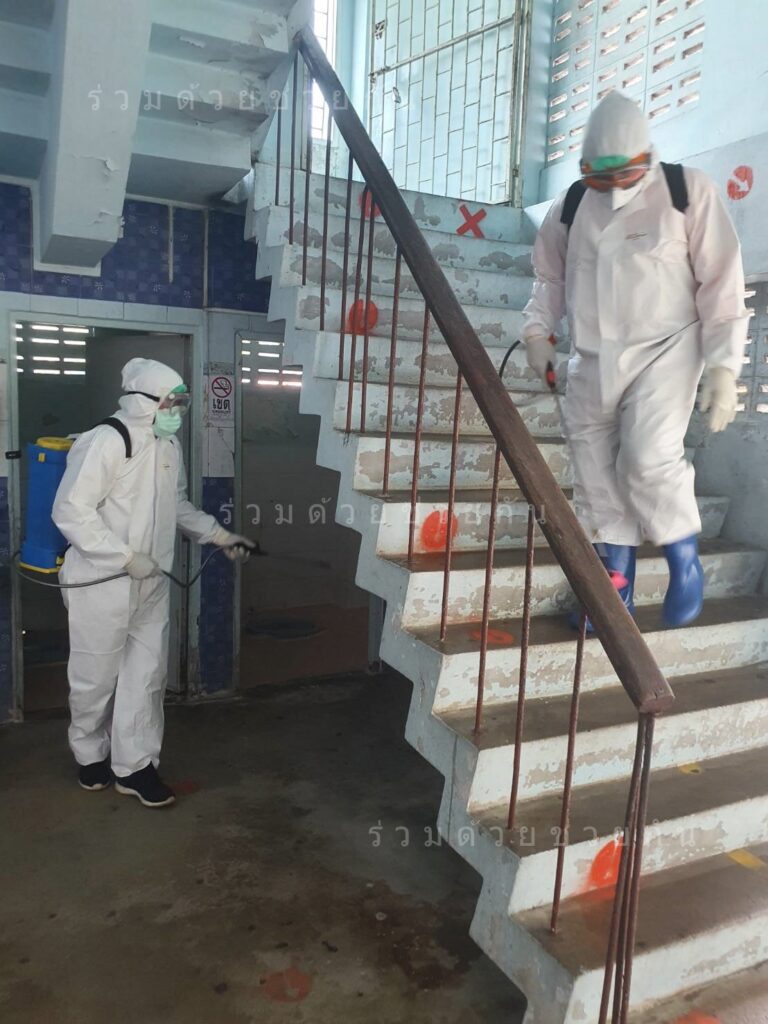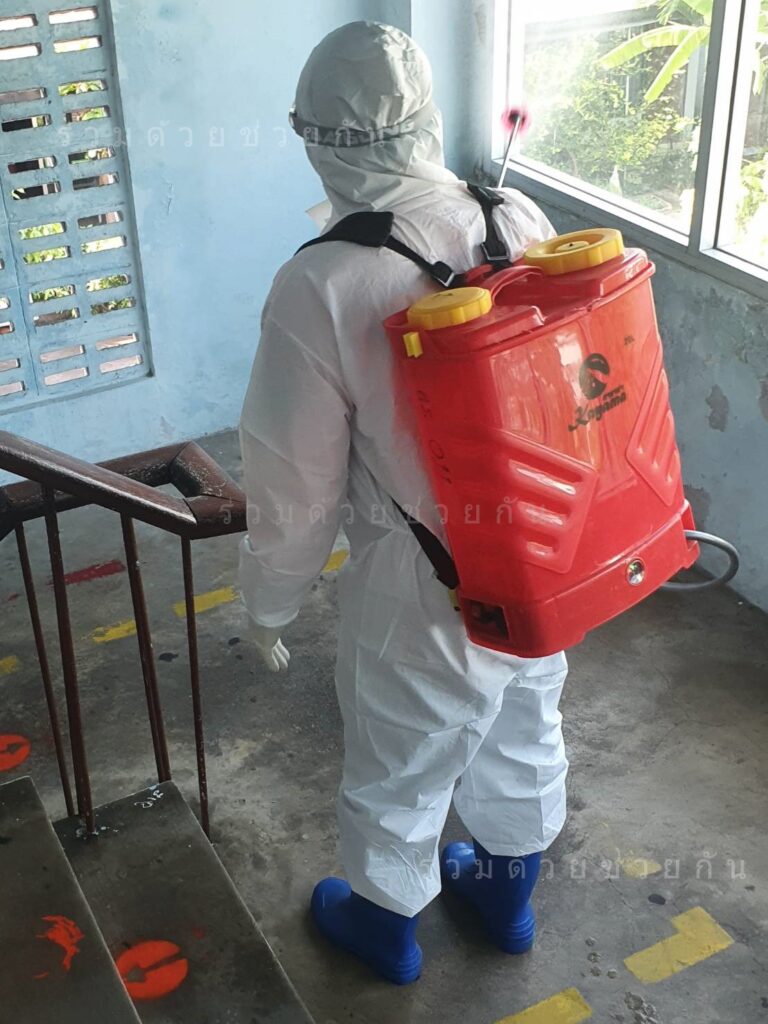 อาสาร่วมด้วย และ อาสาสิริน สวมใส่ชุด PPE พร้อมอุปกรณ์ฉีดพ่น ดำเนินการฉีดพ่นน้ำยาฆ่าเชื้อโรค เพื่อป้องกันการแพร่ระบาดของโรคโควิด-19 ที่โรงเรียนดรุณาลัยสุขุมวิท ซอยสุขุมวิท 36 แยก 1