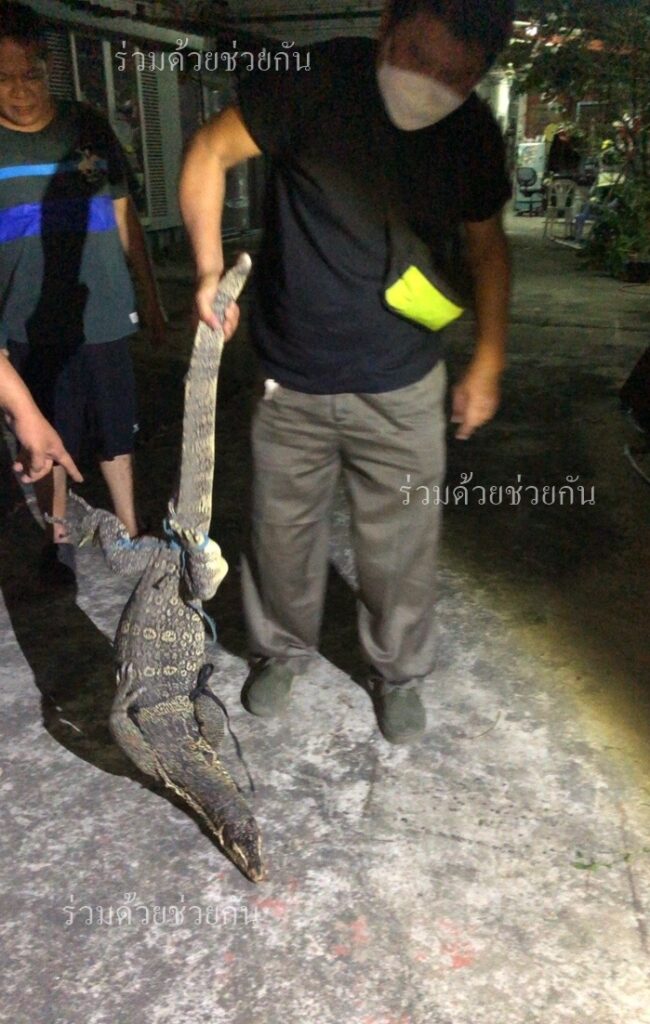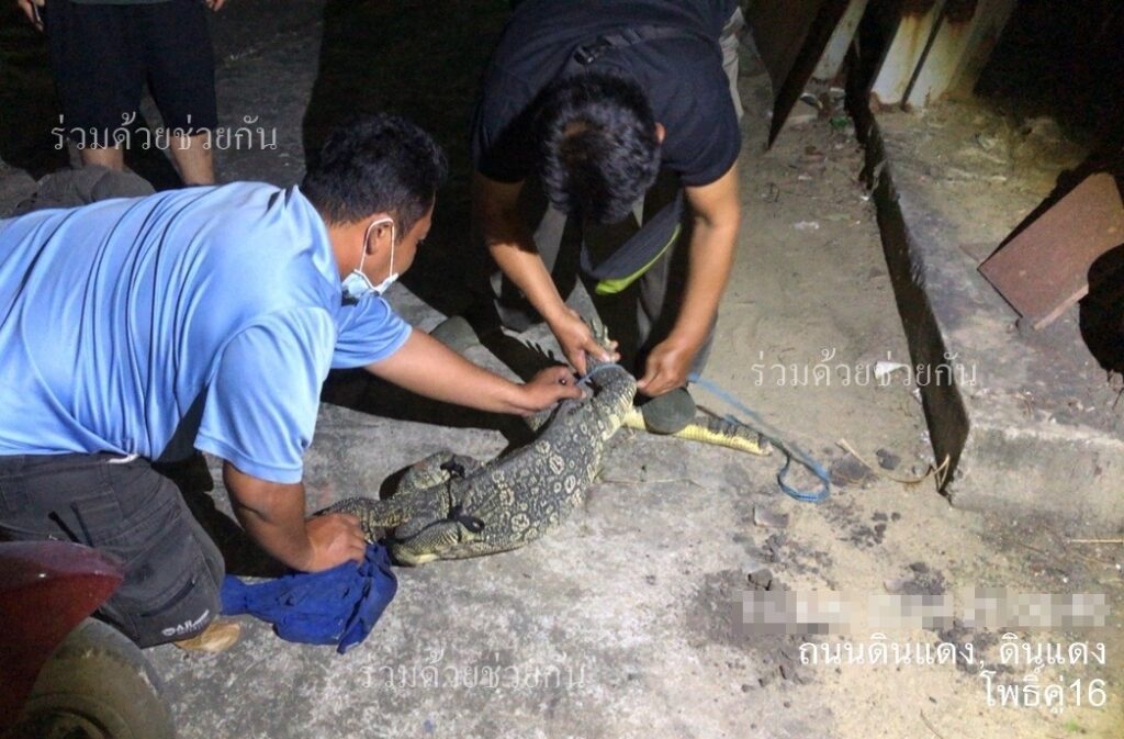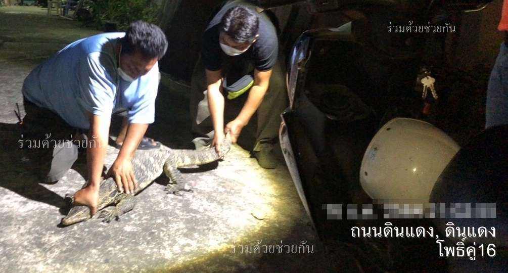 อาสาร่วมด้วยช่วยกัน รับแจ้งจากประชาชนขอความช่วยเหลือจับสัตว์เลื้อยคลาน อยู่อาคารบีเอ็ม ถ.ดินแดง แขวงดินแดง เขตดินแดง กรุงเทพฯ พบเป็นตัวเงินตัวทองขนาดใหญ่จำนวน 1 ตัว ความยาวประมาณ 2 เมตร หลบซ่อนตัวอยู่ในกองกระเบื้องข้างอาคาร