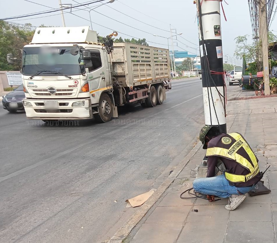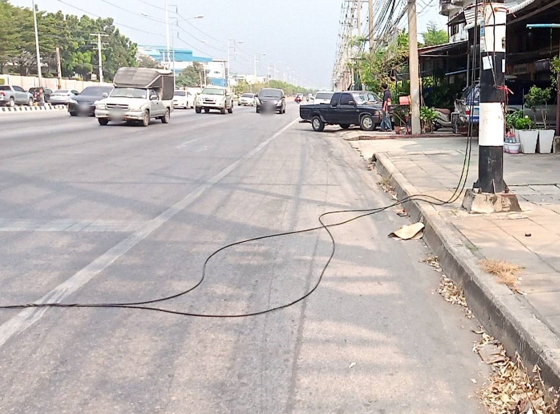 สายสื่อสารขาดห้อยขวางถนน เกี่ยวรถล้ม แยกบ้านขอม ถนนเอกชัย