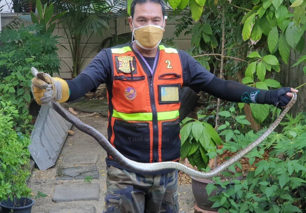 อาสาร่วมด้วยฯ ช่วยจับงูสิงบริเวณสวนหลังบ้าน ซอยพระยาสุเรนทร์ 30 เขตคลองสามวา กรุงเทพฯ