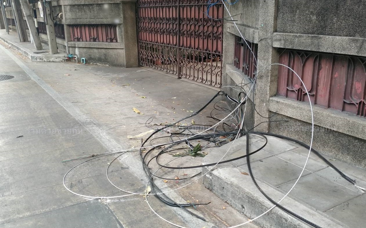 สายสื่อสารขาดห้อยขวางถนน ซอยสุขุมวิท 15 จนท.เร่งเก็บ หวั่นเกิดอันตราย