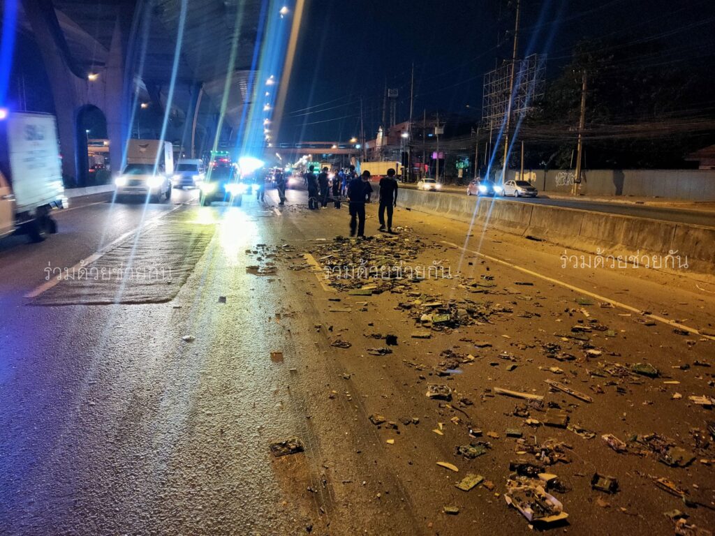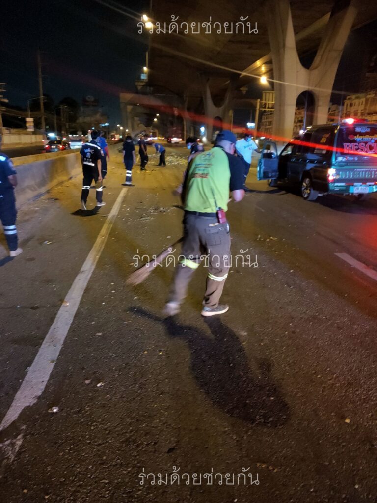 อาสาร่วมด้วยฯ เข้าทำความสะอาด-อำนวยการจราจร รถบรรทุกทำสิ่งของร่วงหล่น ถนนเทพรัตน ขาออก กม.ที่ 18