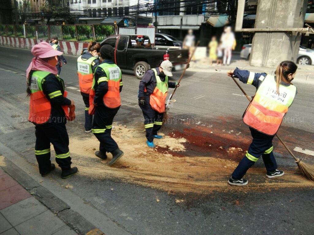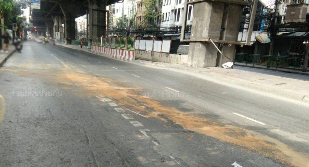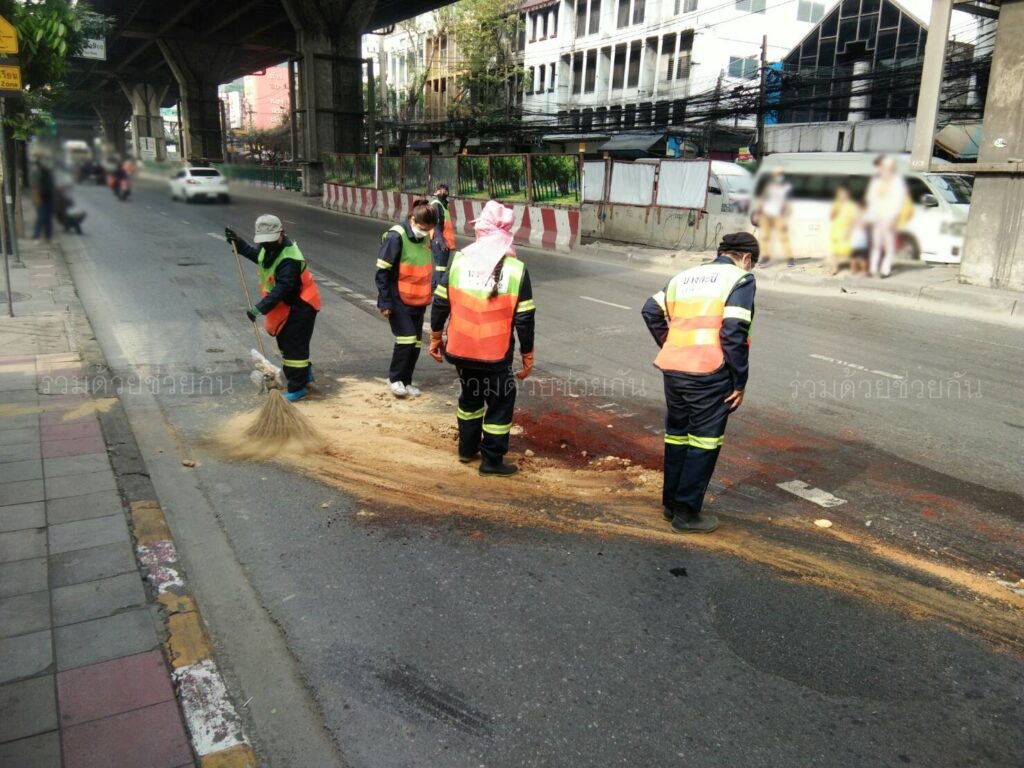 กทม. เร่งทำความสะอาดคราบน้ำมันบนถนน ตรงข้ามโรงหนังเมเจอร์ฮอลลิวูด ถนนรามคำแหง
