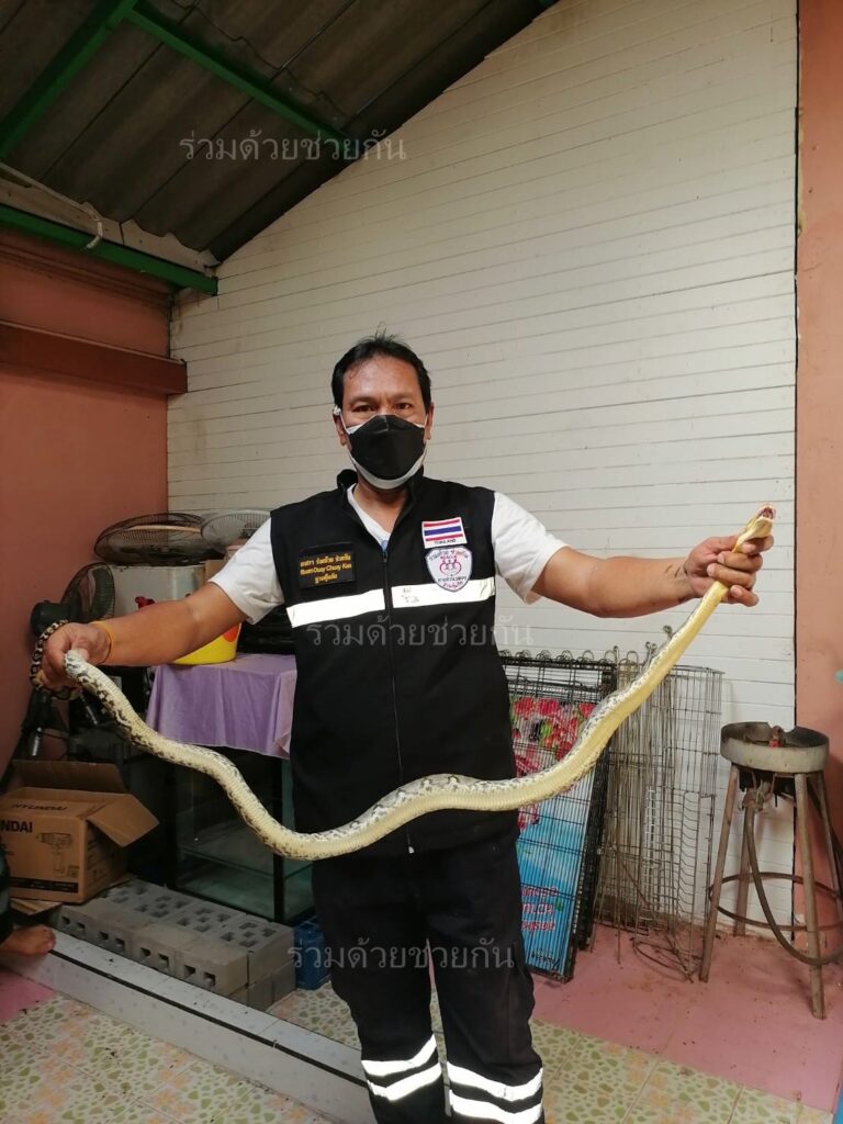 ศูนย์วิทยุร่วมด้วยช่วยกัน รับแจ้งจาก อาสาร่วมด้วยฐานคุ้มภัย เข้าช่วยเหลือประชาชนขอความช่วยเหลือจับงูเข้าบ้าน ภายในซอยรามคำแหง 118 เเยก 48-1 ถนนรามคำแหง แขวงสะพานสูง เขตสะพานสูง กรุงเทพฯ