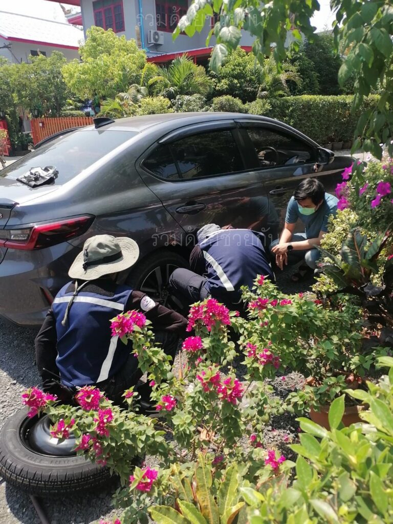 อาสาร่วมด้วยฯ เข้าตรวจสอบ และดำเนินการใช้อุปกรณ์ถอดล้อ และเปลี่ยนยางอะไหล่ให้เรียบร้อยแล้ว สามารถขับรถต่อไปได้